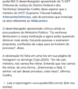 O desembargador aposentado Sebastião Coelho do TJ-DFT, fez uma live no domingo dia para ameaçar de forma séria, o ministro do STF, Alexandre de Moraes que cuida do caso da tentativa de golpe de Estado. O desembargador falou que o Xandão tem que abandonar esses processos ou eles vão retirá-lo de qualquer forma, interrompendo a fala para não se complicar mais.