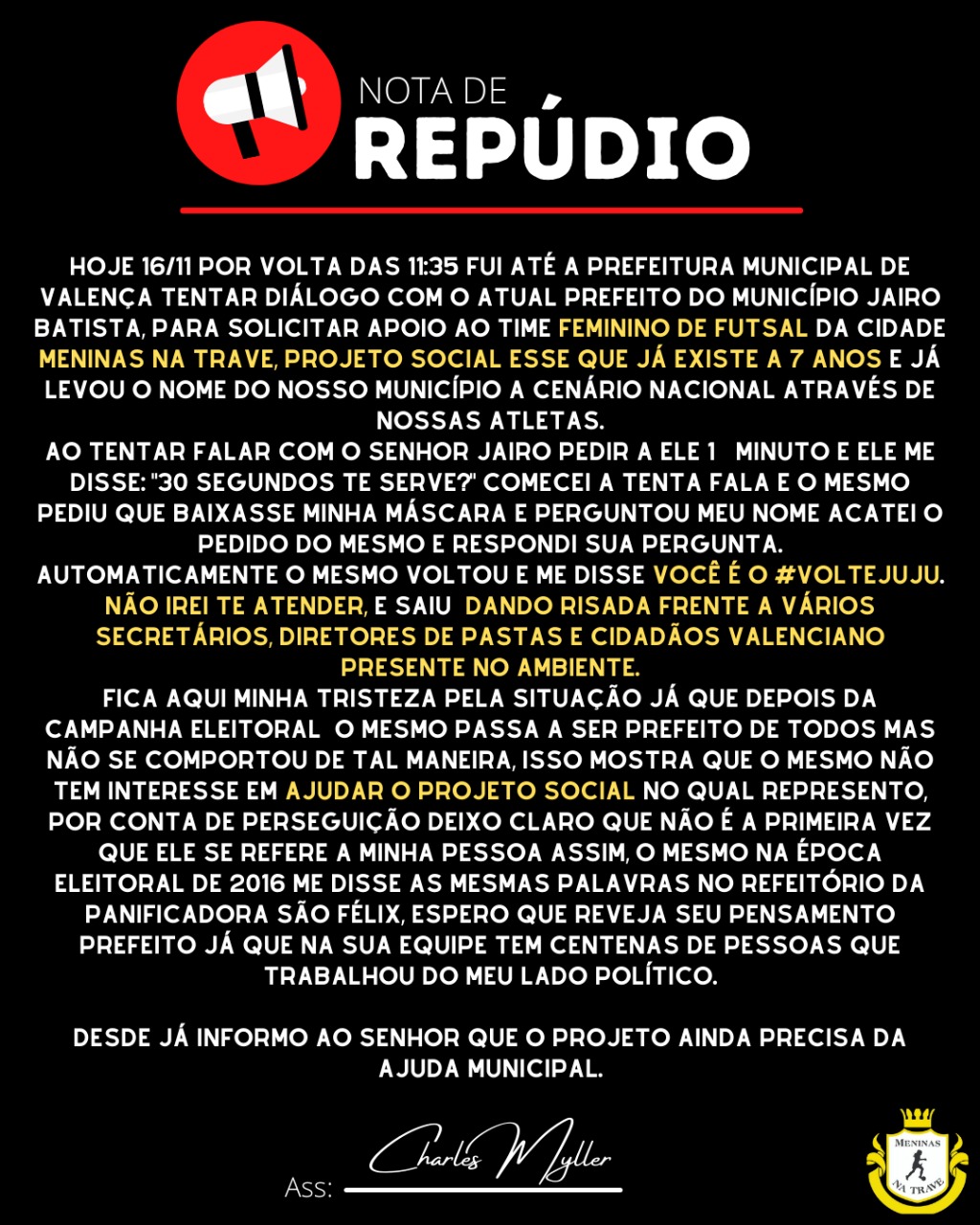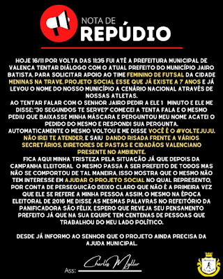 A atitude do prefeito não agrediu apenas você Charles Myller não apenas as mulheres do time de futsal, mas a todos os valencianos, que como eu, defendem e amam a democracia.