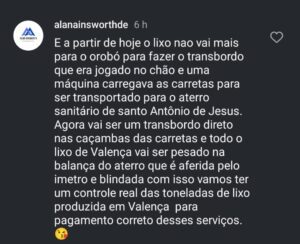 Em conversa com o secretário Alan Ainsworth, este nos revelou que será construído um galpão aqui em Valença para os catadores do Orobó fazerem suas coletas e garantirem suas sustentações econômicas. O que preocupa é que, enquanto isso não acontece muita coleta será perdida e o prefeito precisa resolver urgente essa demanda e garantir um ajuda financeira a esses trabalhadores enquanto não se organiza a coleta seletiva.